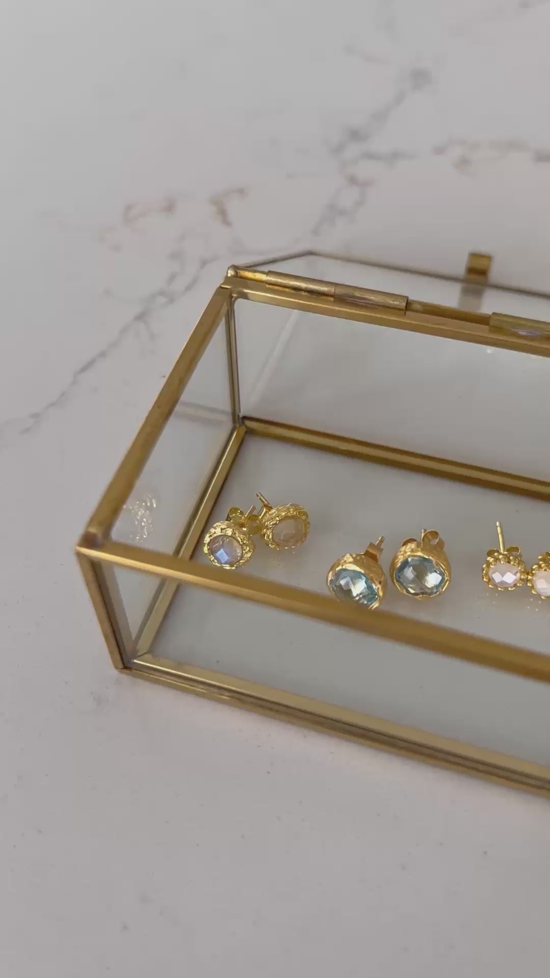 Die Ohrstecker LEILA, aus 925 Sterling Silber vergoldet, lassen den facettierten blauen Topas im Mittelpunkt stehen.